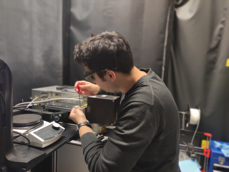 For my research line, I produce new materials employing pulsed lasers. A fascinating aspect about these types of lasers is that unlike the typical continuum wave lasers (from pointer lasers to industrial lasers used for cutting or engraving), the pulsed ones concentrate much energy in very short pulses. The pulses can be so short that extremely fast events, for instance, the movement of electrons inside atoms, can be seen. This is, however, not the only thing we can do with these lasers; their extremely short duration also means the concentration of energy in the pulse is massive, as much as when interacting with any type of matter, including air, liquids, or solids, it is possible to transform it profoundly. Such deep transformations include rearranging atoms or even unifying elements that do not naturally come together.