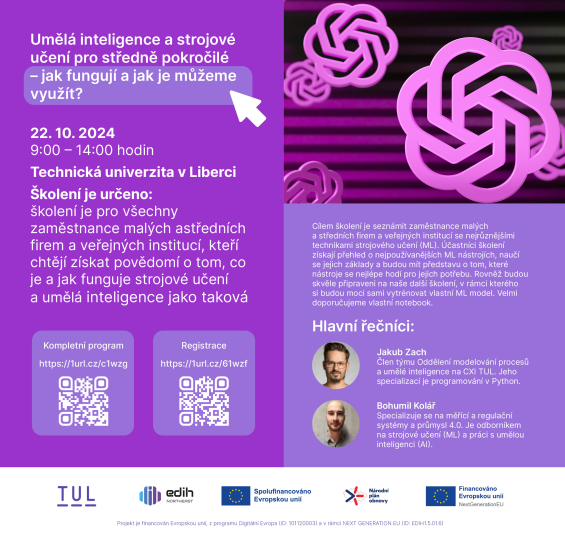 CXI TUL pořádá školení Umělá inteligence a strojové učení pro středně pokročilé - je určeno pro všechny zájemce, především pracující lidi v produktivním věku a podnikatele.