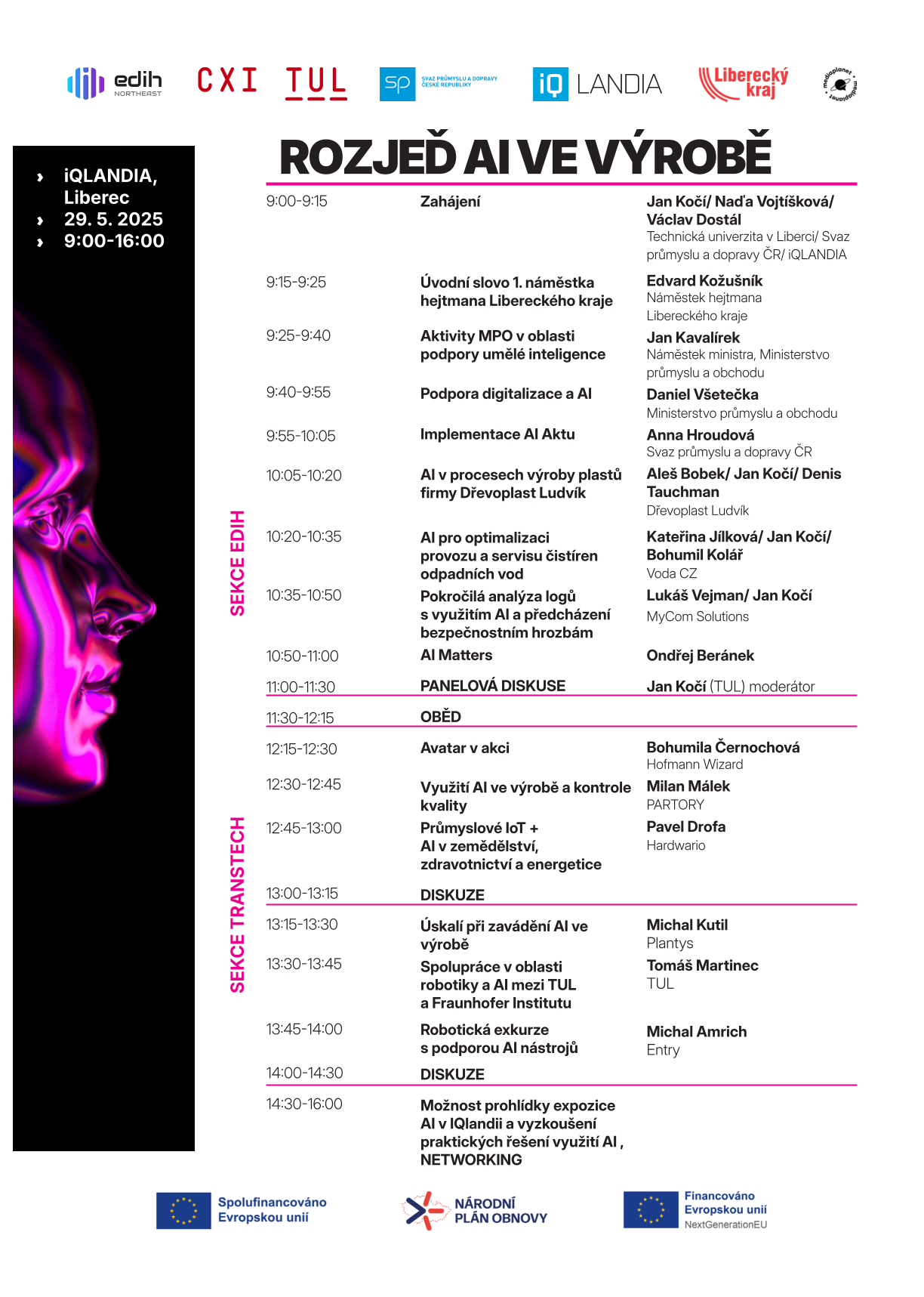 Součástí programu budou také diskuze o tom, jak překonat úskalí při zavádění AI do výroby, jak získat důvěru týmu a proč mindset hraje klíčovou roli v úspěchu inovačních projektů.