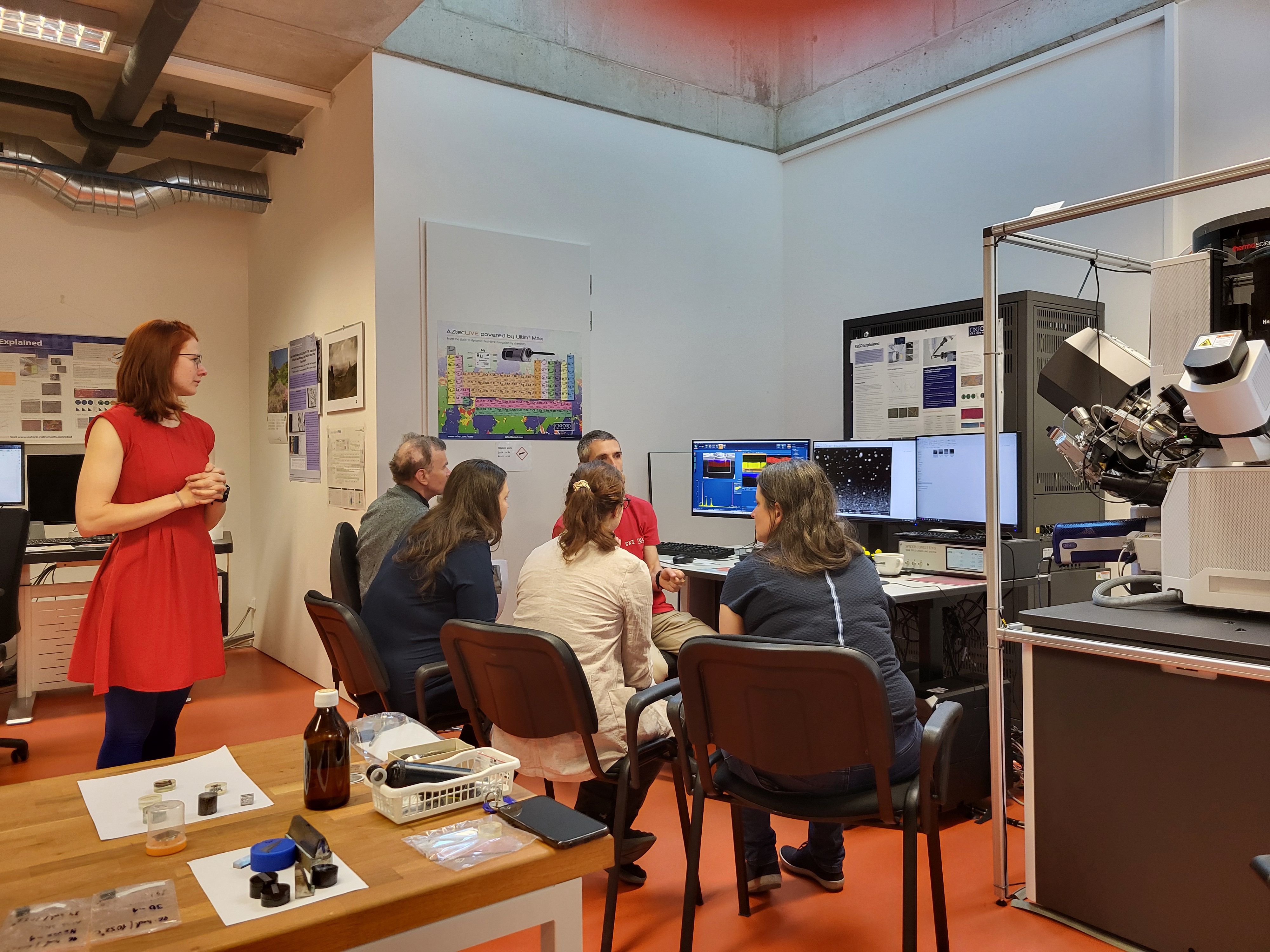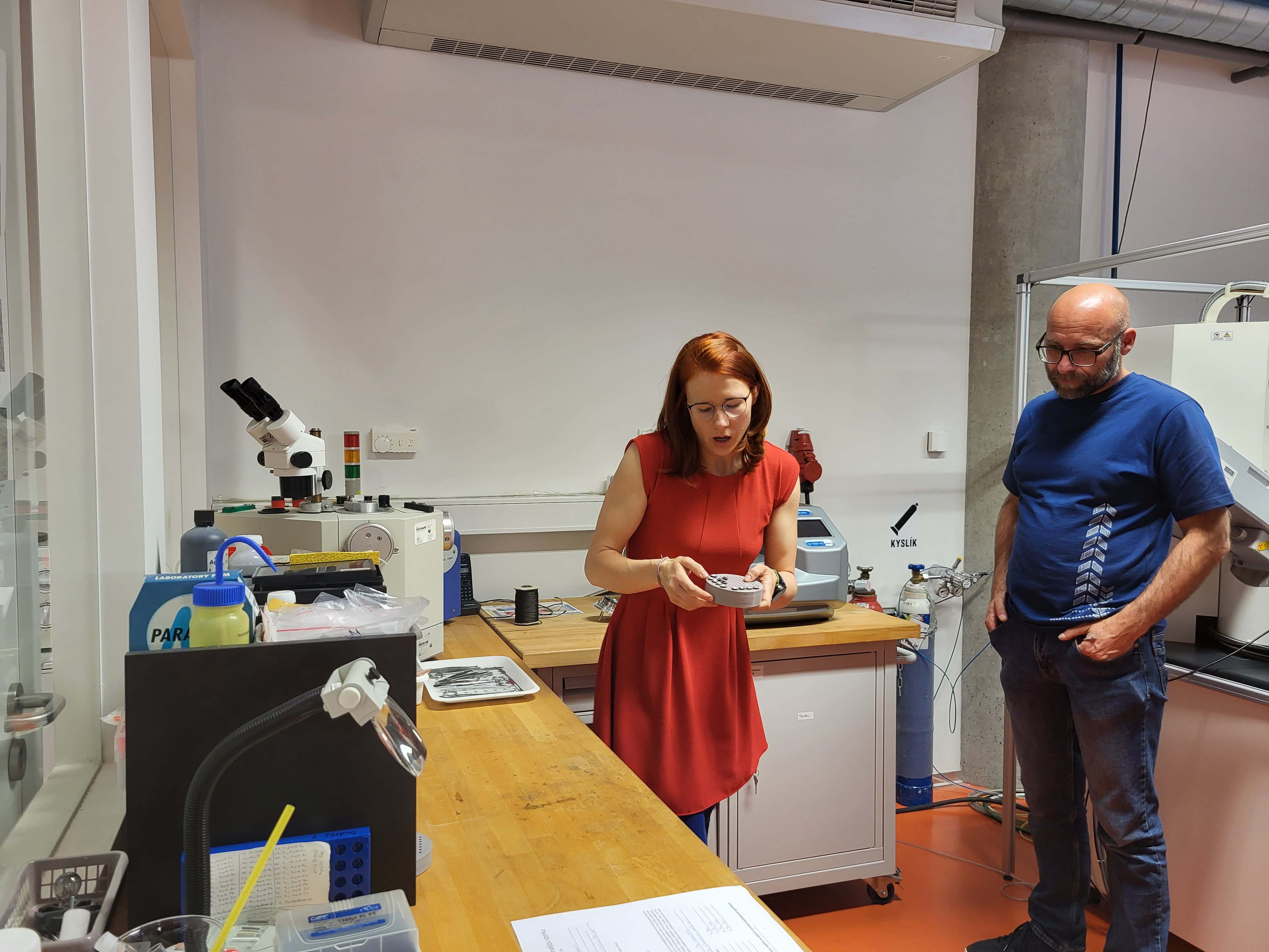 V praktické části workshopu se účastníci přesunuli k samotnému mikroskopu. Někteří si přivezli vlastní vzorky, aby si mohli na vlastní oči prohlédnout, co přístroj dokáže. Účastníci se seznámili s tím, jak vypadá příprava vzorku a jak by měli materiály upravit předem. Pavel Kejzlar demonstroval postupy, jak provádět řezy, krystalografickou nebo chemickou analýzu.