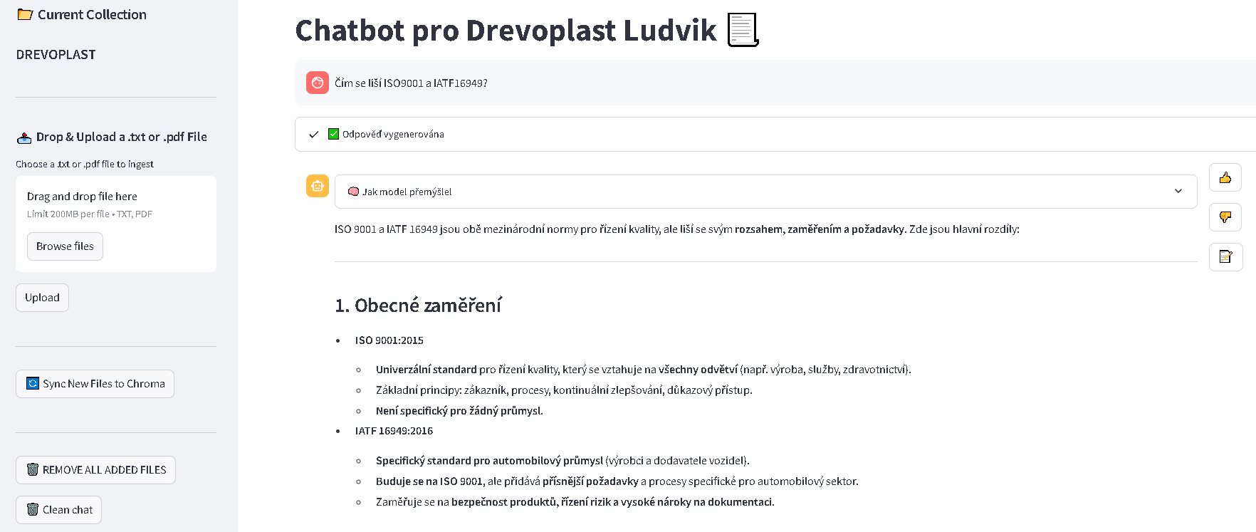 Jedním z důležitých kroků bylo nasazení vlastního chatbota, který zaměstnancům radí s nastavením strojů, ISO dokumentací nebo servisními zásahy.